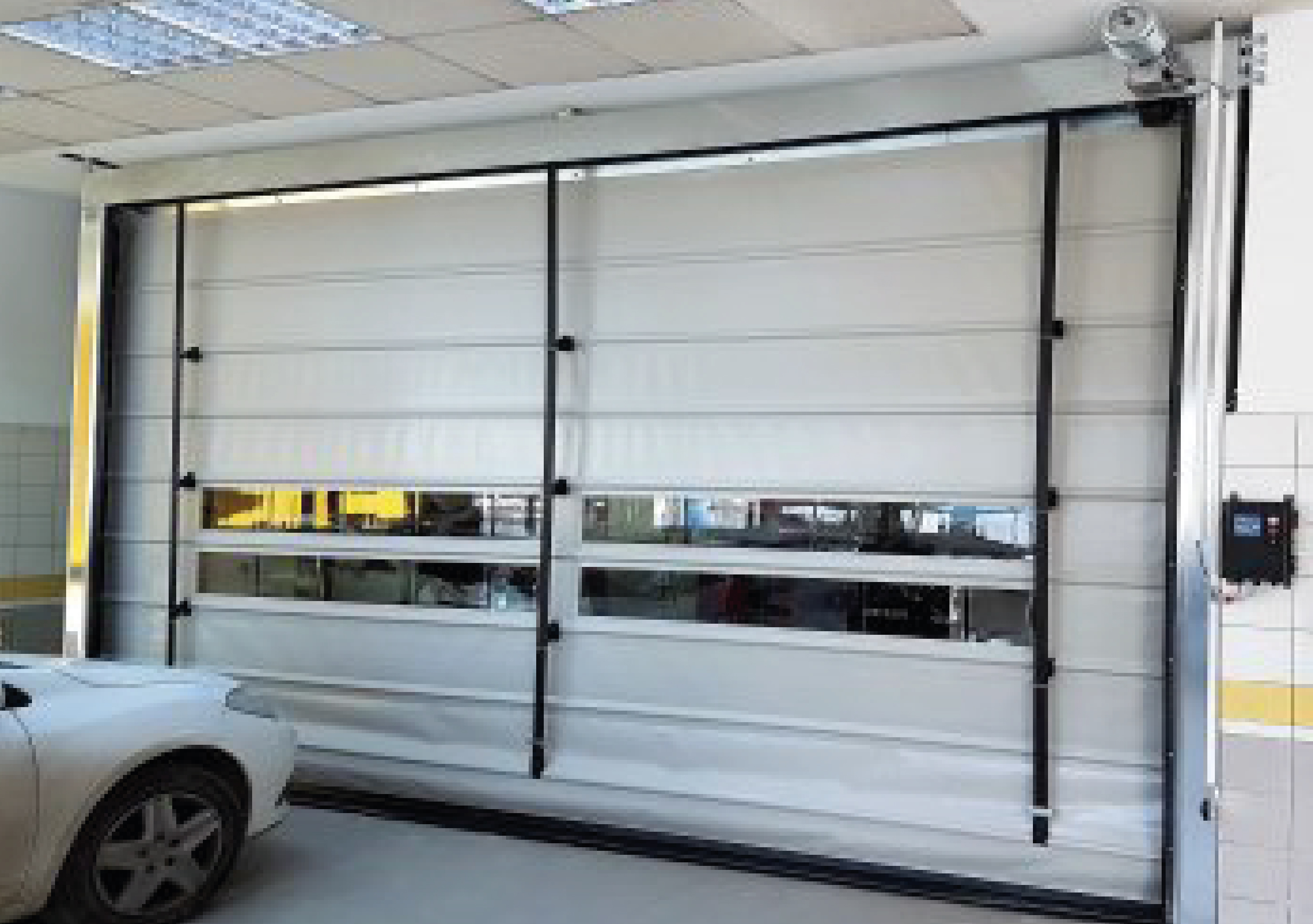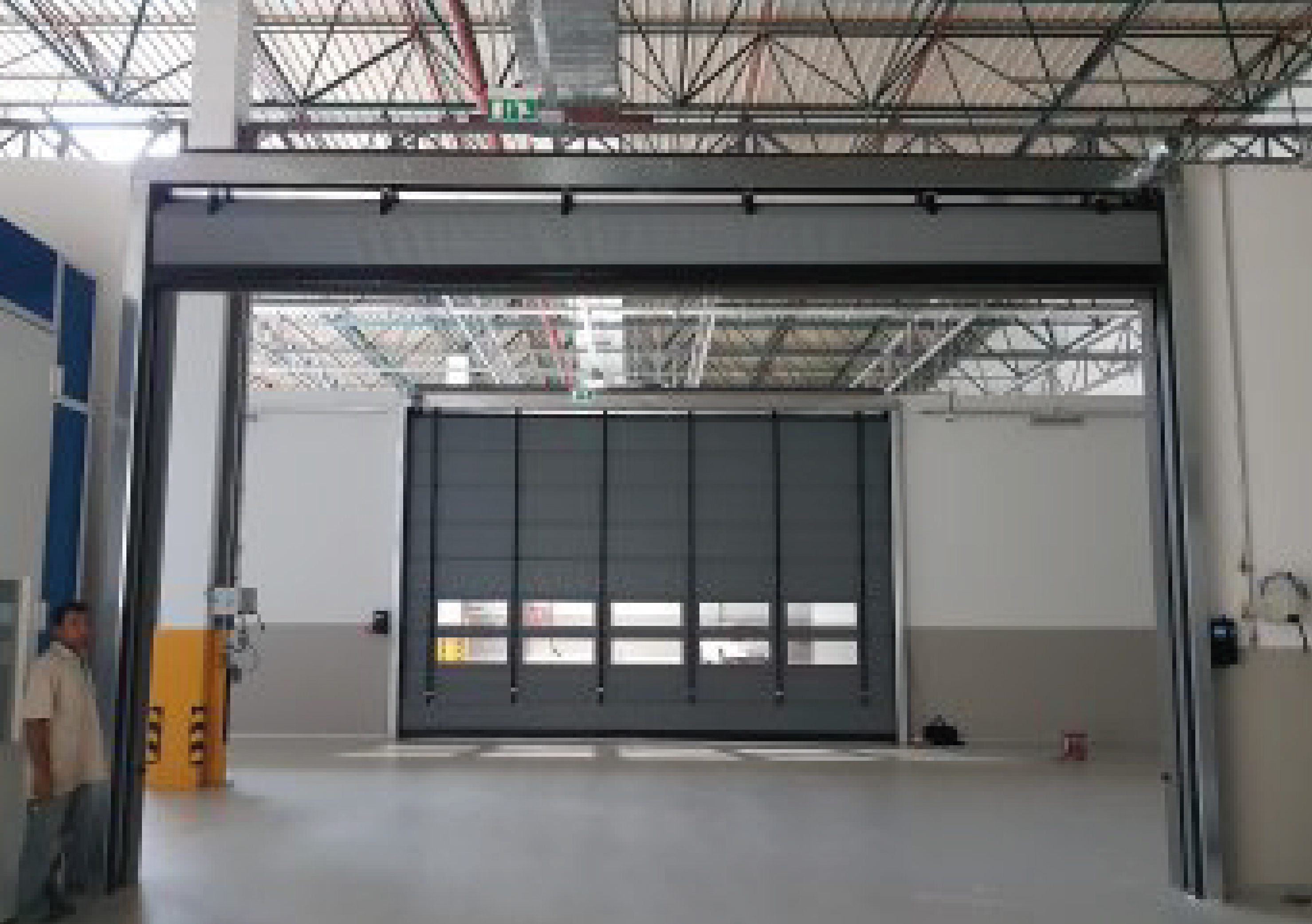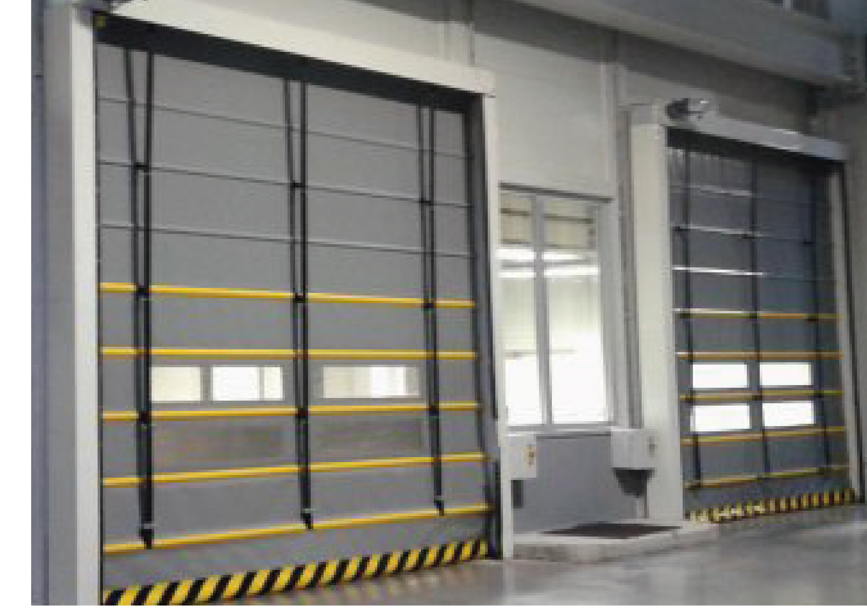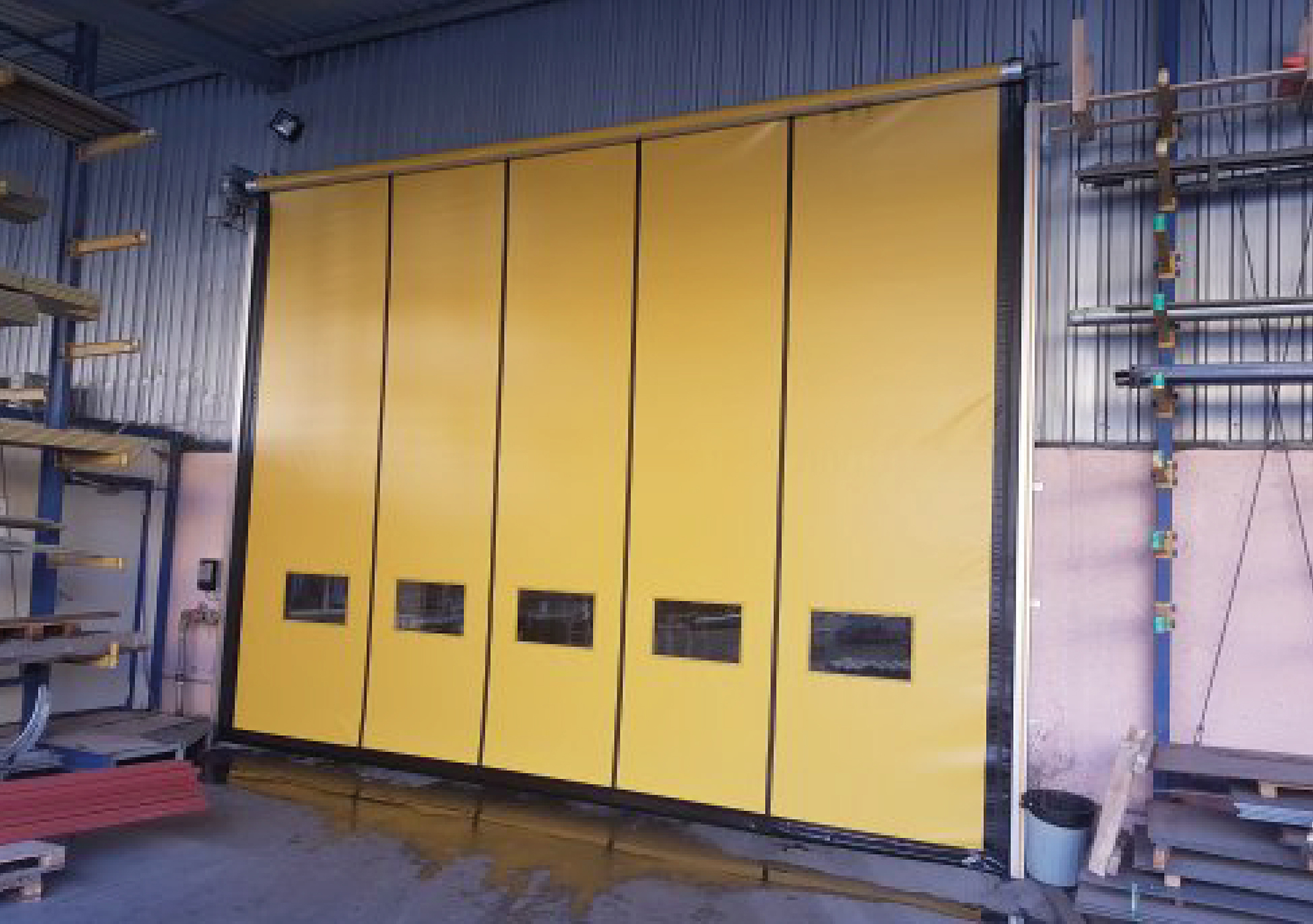 High-speed PVC folding doors are durable and flexible door systems designed to meet the demands of heavy use and rapid access in industrial areas with large openings. The PVC panels fold upward with the help of lifting straps, offering fast opening and closing even in wide spaces ensuring energy savings, dust control and continuous workflow. These doors feature high wind resistance, making them suitable for both indoor and outdoor use. They can optionally be equipped with a transparent vision window. They provide ideal solutions for locations with wide access points such as logistics centers, hangars, large warehouse entrances, factories, and production facilities.